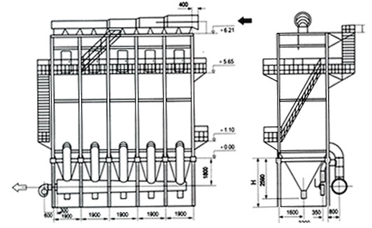 該設(shè)備由含塵氣體入口至凈化煙氣出口,本體結(jié)構(gòu)由進(jìn)氣管路、進(jìn)氣室、袋室、灰斗、排灰閥、出口管道及反吹風(fēng)系統(tǒng)和清灰控制系統(tǒng)所組成。