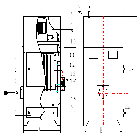 含塵氣體進入箱體,由扁布袋過濾器進行過濾,粉塵被阻留在除塵布袋外表面,已凈化的氣體通過濾袋進入風機,由風機吸入直接排入室內(nèi)(也可接管排至室外)。