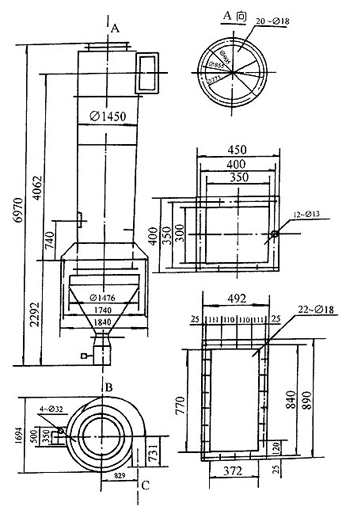 1、本除塵器可由單筒及數(shù)個單筒組合使用,單筒處理風(fēng)量為15000-18000m3/h。