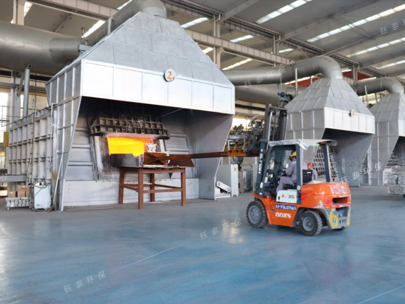 再生鋁雙室爐煙氣處理系統(tǒng)采用XLP高效旋風(fēng)除塵器+強制排風(fēng)冷卻器+脈沖布袋除塵器組成,雙室爐爐門排煙采用2個排煙罩,2個爐門罩交替打開;并配套爐膛排料輔助排煙系統(tǒng),1套雙室爐煙氣處理系統(tǒng)處理風(fēng)量≥130000m3/h。除塵器運行后將雙室爐燃燒過程產(chǎn)生的高溫?zé)煔猓囟龋?50℃)和爐門罩排出的煙氣全部收集干凈,保證了工人的操作環(huán)境,達到了規(guī)定的排放標準,給生產(chǎn)企業(yè)帶來了巨大的經(jīng)濟效益。除塵器收集的顆粒污染物主要是熔煉過程中產(chǎn)生的金屬氧化物和非金屬氧化物,還有大量碳?;曳莸?,除塵脫硫后:煙塵濃度:≤10mg/m3。